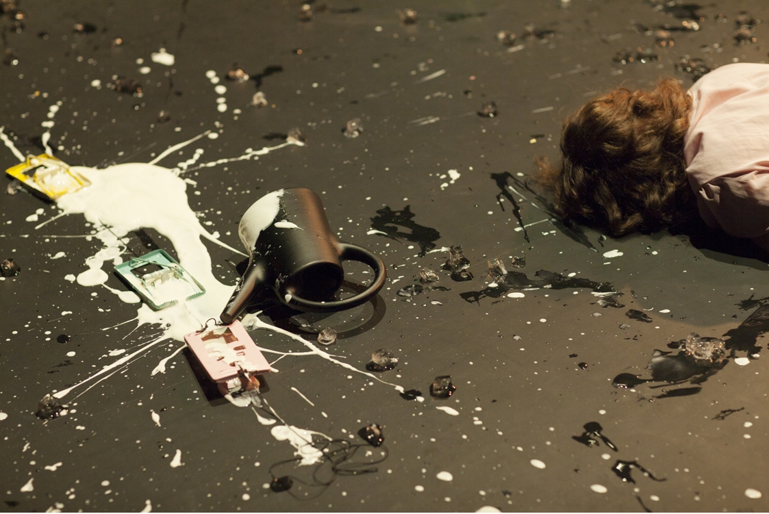In einem Moment ordnen sie sich in einer Linie und jede beginnt, von ihrem Leid zu singen. Über den Freund, der sie verlassen hat, über Nieztsche und das Nichts und über die die Schwierigkeit zu schreiben. Diese konkreten Erzählungen wirken nach all den Spielereien auf der Bühne befremdlich. Später ordnen sich die Frauen im hinteren Bühnenraum wieder horizontal an und lachen laut, fratzenhaft. Dann verlieren sie sich wieder in weiteren Nichtigkeiten. Am Ende ist die Bühne leer. Nur der Schmutz lässt ahnen, welches Chaos eben auf der Bühne passierte. Die Frauen verschwinden im blauen Lichterspiel. Die Aufführung verliert sich im Nichts. So wie sie begann. Die Dramatik der Musik bleibt.