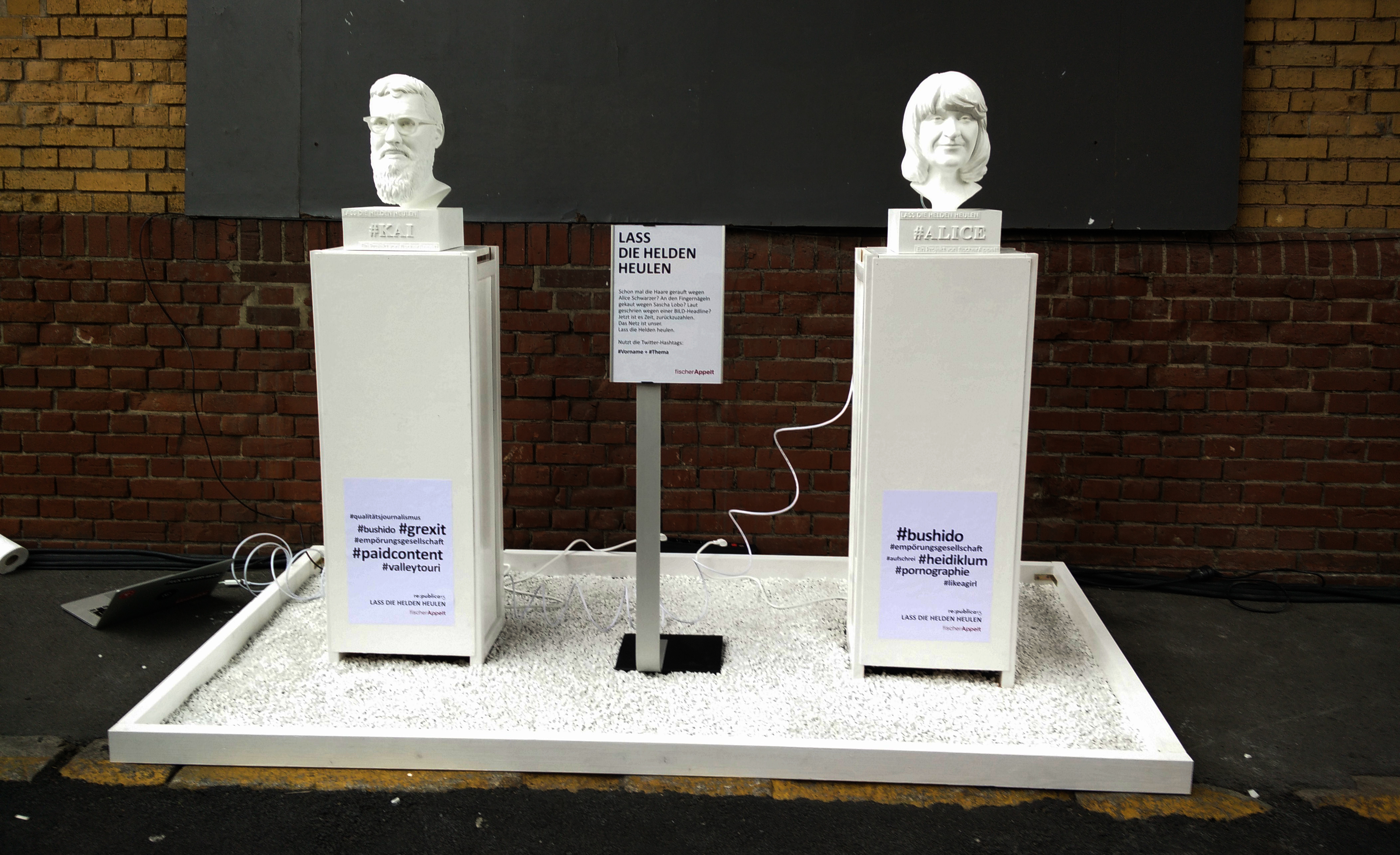 Die Agentur fischerAppelt trifft den Zeitgeist mit einer Büste von Kai Diekmann. Twittert man mit Hashtag zu seinem Vornamen die Stichworte qualitätsjournalismus, bushido, grexit, empörungsgesellschaft, paidcontent, valleytouri heult Diekmann auf, denn der BILD-Chef möchte diese Wort wohl so gar nicht hören beziehungsweise lesen. Bei dem Stichwort empörungsgesellschaft und bushido jault übrigens auch Alice Schwarzer, deren Kopf ebenfalls auf einer Säule trohnt. aufschrei, heidiklum, pornographie und likeagirl sind ihre Reizworte. Die re:publica ist eben immer wieder für einen Lacher gut.